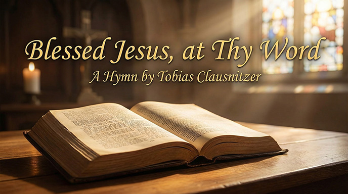 The hymn known in English as "Blessed Jesus, at Thy Word" (sometimes rendered as "Blessed Jesus, at Your Word") originated as a German Lutheran hymn titled "Liebster Jesu, wir sind hier" ("Dearest Jesus, we are here").